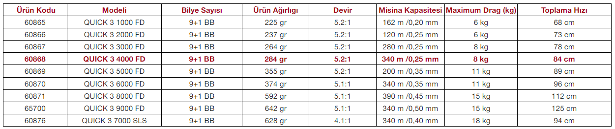 Quick ® 3 Serisi, tüm Quick® programı içinde yeni bir gelişmedir. Almanya'da tasarlandı, üretim aşamasında sadece en iyi parçalar kullanıldı. Ürün yelpazesi, hafif spin avları için küçük boy makineler ile yayın ve diğer iri oyuncular için büyük boy freespool makineleri içerir. En kuvvetli balıklara karşı koyacak kadar güçlü. Süper pürüzsüz çekiş sistemi, güçlü ve tutarlı çark yapısıyla sizi sahillere çağırıyor. 1000 - 9000 boylarda mevcut. Bunun yanında uzun mesafe sazan veya kıyıdan balıkçılık için bir Quick® 3 SLS var.